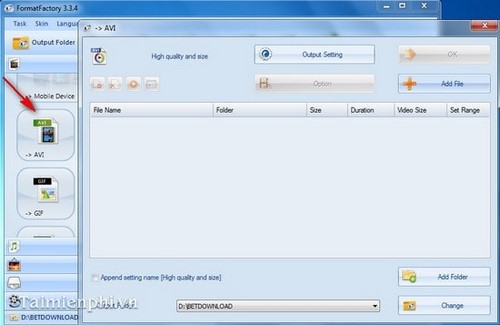 Bước 3: Ấn vào Add File và chọn đến file mà cần chuyển định dạng. Sau khi chọn xong bạn có thế lựa chọn các tùy chọn cho video ở nút Output Setting, ở đây đã có sẵn các cấu hình bạn có thể lựa chọn nhanh. Nhấn OK